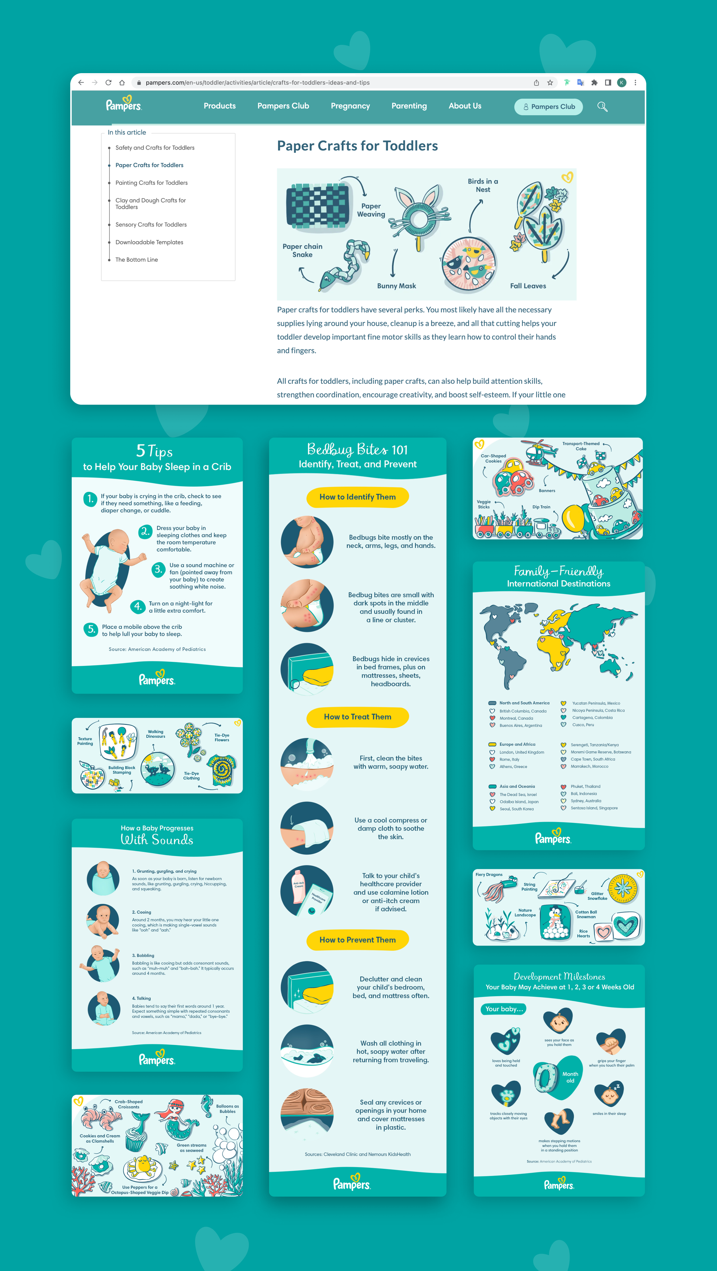At Pampers, I worked on refining their visual brand identity to ensure it connected with their broader goals. A big part of this involved understanding consumer needs and collaborating with the Head of Art to review and approve illustration assets for the team.